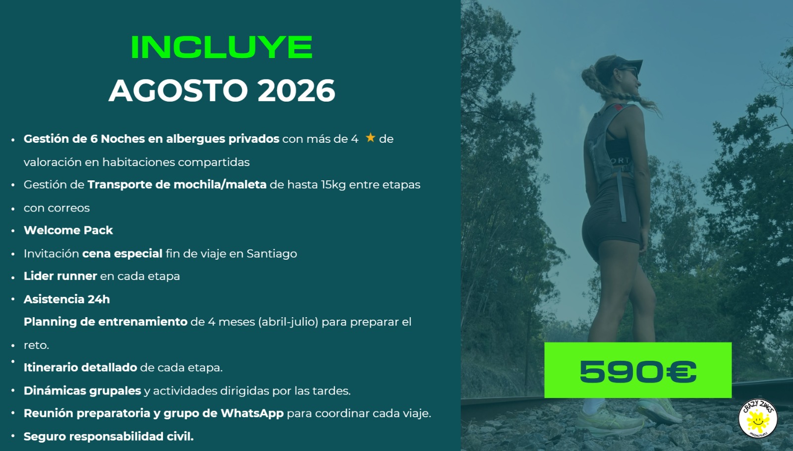 Nunca imaginé que podría correr y caminar 120 km, pero con Crazy Zings lo conseguí. La preparación y el apoyo del grupo hicieron que cada etapa fuera un reto superado. Cruzar la meta en Santiago fue un momento inolvidable.
